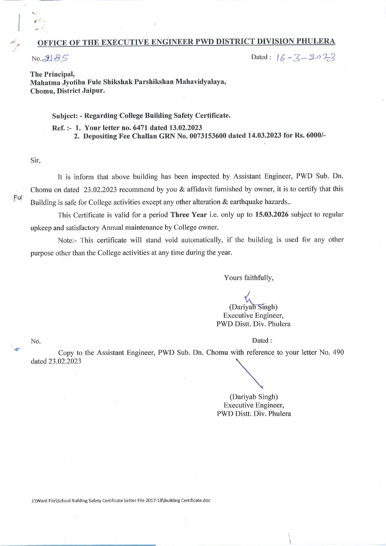 The College is located in semi urban area in town Chomu, Teshil, headquarter in khasara number 249,246,250,1414/2. The College campus is huge and built in pollution free healthy environment having peaceful of area of approx.- 3600 Sqm.